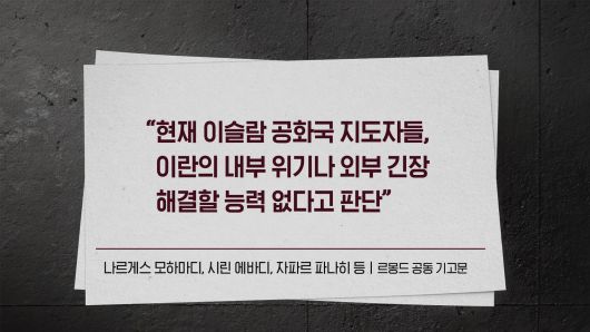 이렇게 악화된 경제 현실 속에서 노벨 평화상 수상자인 반정부 인권운동가인 나르게스 모하마디 그리고 시린 에바디와 올해 칸 영화제의 황금 종려상을 받은 영화감독 자파르 파나이 등은 현지 시각 16일 프랑스 일간 르몽드에 공동 기고문을 내기도 했습니다.