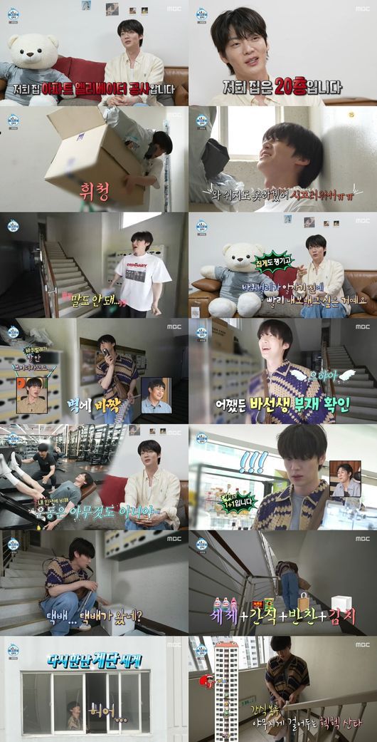 그런가 하면 안재현은 아파트 엘리베이터 교체 공사로 20층의 계단을 오르내리며 ‘천국과 지옥’을 오가는 일상을 공개했다. 분리수거를 위해 재활용 쓰레기를 한가득 안고 계단을 내려가는 안재현은 “20층, 아무것도 아니에요”라며 그동안 쉬지 않고 이 순간을 위해 운동으로 체력을 키웠다고 밝힌다. 그러나 얼마 못 가 휘청거리는가 하면 계단 중간에 마련된 의자에 털썩 주저앉아 웃음을 자아냈다.