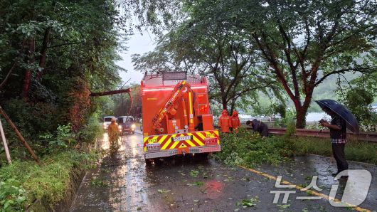 장맛비가 이어지고 있는 21일 오전 6시 40분쯤 함평군 대동면의 한 도로에 나무가 쓰러져 소방당국이 안전조치를 하고 있다. (전남소방 제공. 재판매 및 DB 금지) |
