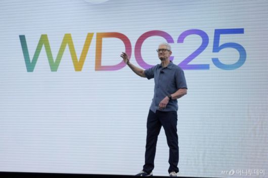 [쿠퍼티노=AP/뉴시스] 팀 쿡 애플 최고경영자(CEO)가 9일(현지 시간) 미 캘리포니아주 쿠퍼티노 애플 본사에서 열린 '세계개발자회의(WWDC) 2025'에서 기조연설하고 있다. 애플은 이날 운영체제(OS) 개편을 발표하면서 새로운 사용자인터페이스(UI) '리퀴드 글래스'를 공개했다. 2025.06.10. /사진=민경찬 |