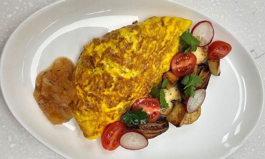 <만들기> ① 달걀과 휘핑크림을 섞은 뒤 소금과 그라나 파다노 치즈를 넣는다. ② 팬에 기름으로 코팅하고 버터를 두른다. ③ 양송이버섯과 양파를 볶은 뒤 달걀물을 넣고 스크램블을 만든다. ④ 달걀이 익으면 반으로 접는다.