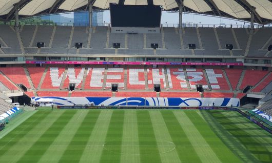 지난 10일 ‘2026 북중미 월드컵’ 아시아 3차 예선인 우리나라 축구 국가대표팀과 쿠웨이트의 경기를 앞두고 서울 마포구 서울월드컵경기장 북측(N) 관중석에 ‘WE 대한’ 카드섹션이 설치돼 있다. 붉은악마 제공 |