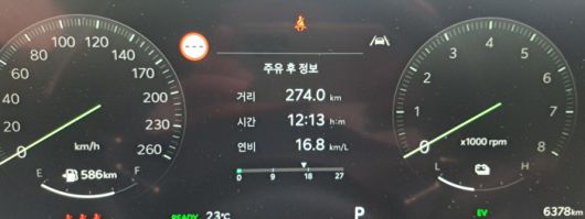 274㎞를 달리는 동안 실측 연비가 공인 복합 연비 대비 약간 낮은 수치는, 여름철 냉방 가동과 정체 구간이 많았던 점을 고려하면 납득이 간다.