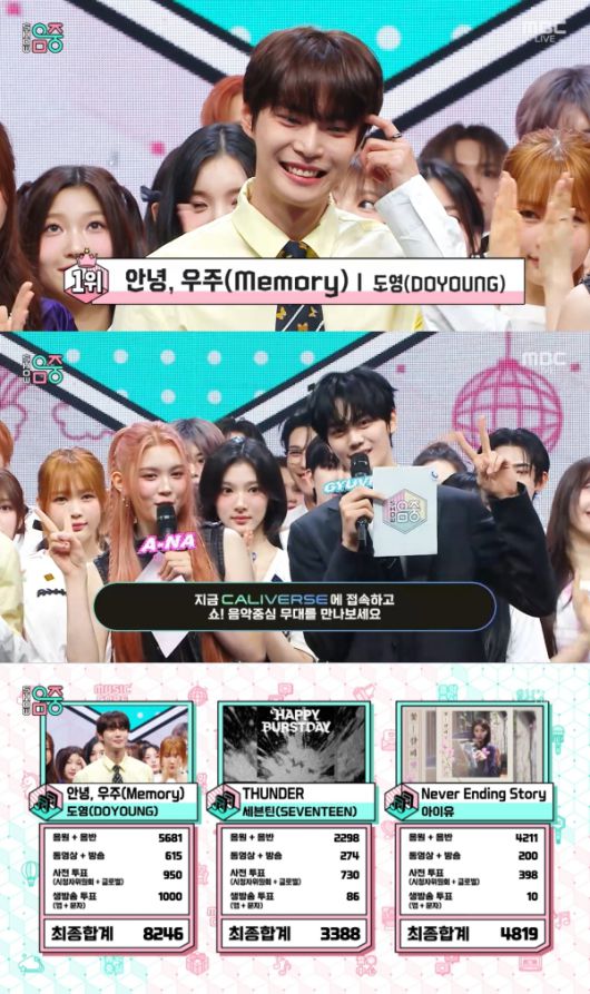 21일 방송된 MBC '쇼! 음악중심'에는 NCT 도영 '안녕, 우주(Memory)', 세븐틴 '썬더(THUNDER)', 아이유 '네버 엔딩 스토리(Never Ending Story)'가 1위 후보로 올랐다.
