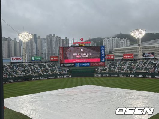 그런데 오후 4시를 넘어간 시점에서 다시 빗줄기가 뿌리기 시작했다. 이미 관중 입장은 시작된 상태. 빗줄기는 다시 굵어졌다. 대형 방수포가 다시 깔렸다. KBO 오석환 경기감독관은 일단 오후 5시, 경기 개시 시간까지는 기상 상황을 지켜본다는 입장이었다.