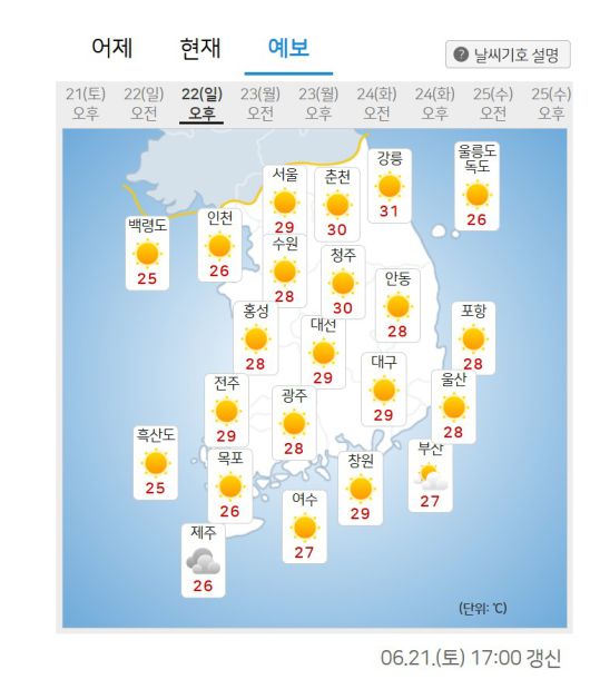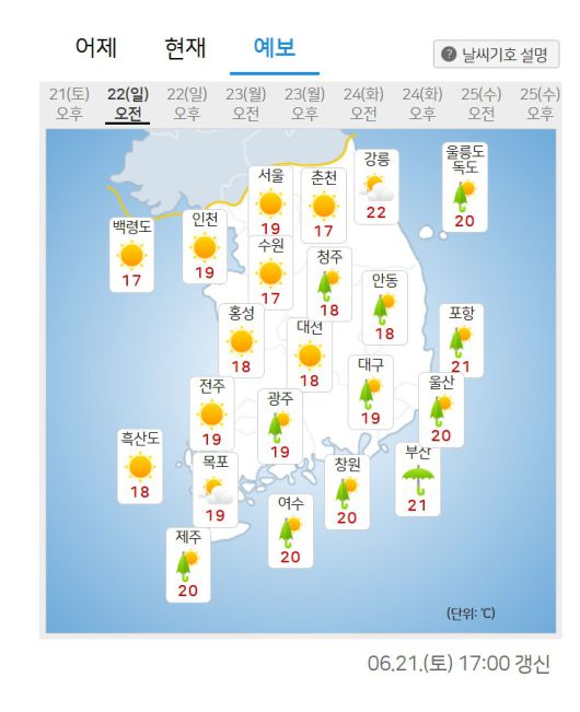22일 아침 최저기온은 서울 19도, 인천 19도, 수원 17도, 춘천 17도, 강릉 22도, 청주 18도, 대전 18도, 전주 19도, 광주 19도, 대구 19도, 부산 21도, 제주 20도 등이다.