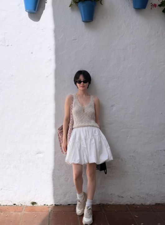 공개된 사진 속 송혜교는 은은한 니트 슬리브리스와 풍성한 실루엣의 화이트 스커트를 매치해 감각적인 썸머룩을 완성했다. 양말과 운동화 패션으로 발랄함을 더했다. 여기에 잔잔한 골드 액세서리와 미니 선글라스를 더해 스타일리시함을 배가시켰다. 특히 짧게 자른 숏컷 헤어스타일과 내추럴한 미소가 이국적인 배경과 어우러지며 한 폭의 화보 같은 분위기를 자아냈다.