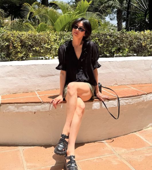 또 다른 사진에서는 블랙 블라우스와 카키 쇼츠를 매치해 도회적인 무드를 선보였다. 강렬한 햇살 아래에도 송혜교의 투명한 피부와 우아한 아우라는 단연 돋보였다. 40대란 나이를 무색하게 만들기도 하고, 나이에 걸맞는 고혹미도 자아내는, 다양한 콘셉트와 색깔을 소화하는 송혜교다.