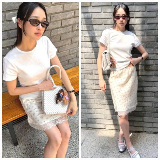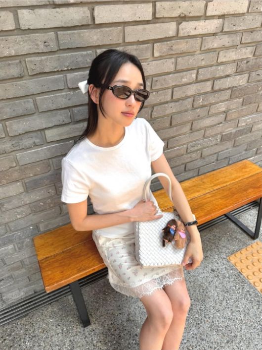 화이트 티셔츠에 레이스 스커트, 몽키 키링이 달린 토트백까지 더한 ‘심플하지만 센스 있는’ 스타일링이 돋보였다.
