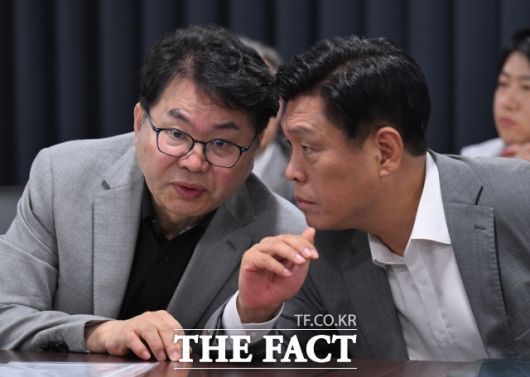 국민의힘은 21일 국정기획위원회에서 각 부처 업무보고가 잇달아 파행을 빚고 있는 데 대해 "이재명 정부의 적폐몰이 시작"이라고 비판했다. 사진은 이한주 국정기획위원장(왼쪽)과 조승래 대변인이 전날 검찰청 업무보고에서 대화하는 모습. /이새롬 기자 |