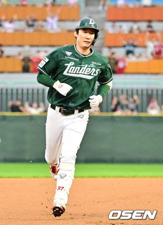 [OSEN=인천, 박준형 기자] 21일 오후 인천 SSG랜더스필드에서 ‘2025 신한 SOL BANK KBO리그’ SSG 랜더스와 KIA 타이거즈의 경기가 진행됐다. 이날 SSG는 김광현을, KIA는 양현종을 선발투수로 내세웠다. 6회말 SSG 선두타자 오태곤이 솔로홈런을 날리고 베이스를 돌고 있다. 2025.06.21 / soul1014@osen.co.kr
