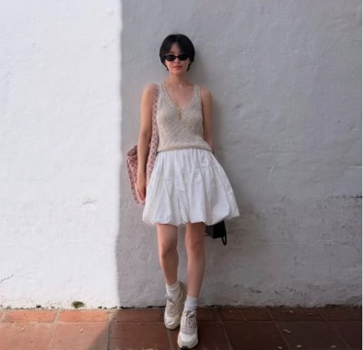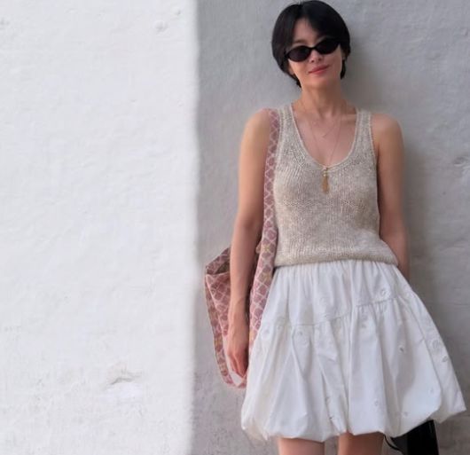 한 장은 흑백, 한 장은 컬러였지만, 두 사진 모두에서 그녀는 단발머리와 민소매 니트 톱, 그리고 봉긋한 실루엣의 흰 치마로 여름 한복판의 감성을 완성했다.