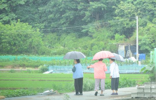 20일 오전, 지난해 7월 집중 호우로 갑천 제방이 무너지며 침수 피해를 입은 대전 서구 용촌동 정뱅이마을에서 주민들이 비가 쏟아지자 불안한 마음으로 논을 바라보고 있다. |