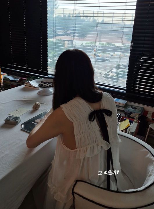 이날 고현정은 홈 웨어로 린넨 소재의 흰 원피스를 입고 등에는 리본을 묶을 수 있는 형태의 뒷모습을 공개했다. 긴 머리카락을 늘어뜨린 채 "뭐 먹지?"라며 고심하는 고현정의 뒷모습은 가녀리기 짝이 없었다. 또한 민낯에 머리를 질끈 묶고 카메라를 만지고 있는 고현정의 모습은 사랑스러운 느낌이었다.