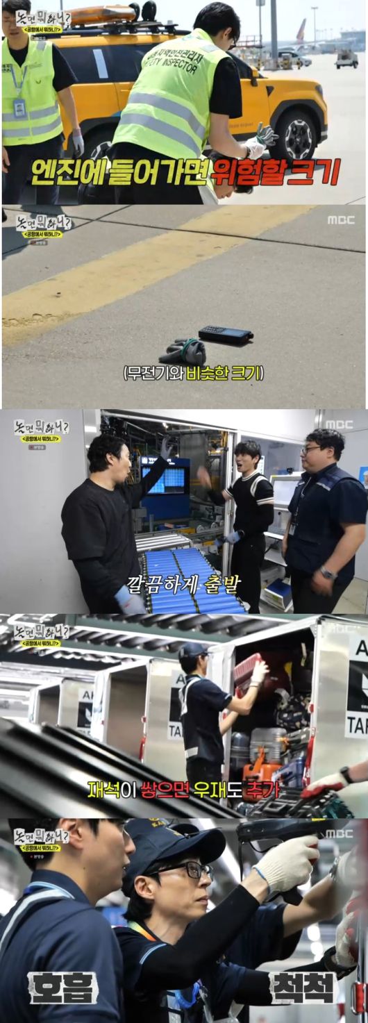 그렇게 인천공항 이동지역 안전 관리소에 내린 멤버들은 비행기 이착륙을 위한 이물질 점검 업무를 돕기로 했다. 유재석과 주우재는 공항 외부 안전을 지키는 작전 차량에 탑승한 후 직접 무선을 해보기도.