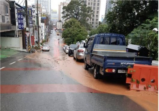 거센 장맛비가 몰아친 21일 오전 광주광역시 서구 쌍촌동 한 도로에 인근 공사장 토사가 빗물을 타고 유출되고 있다. (연합뉴스 제공) |