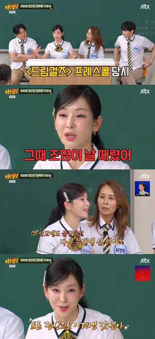 정선아는 "나는 프레스콜이라고 기자들이 왔을 때 조명이 나를 때렸다. '드림걸스' 때였는데 유튜브에 되게 유명해졌다"라며 아찔했던 경험담을 밝혔다. 그는 "보통은 실려 가야 한다. 진짜 아팠다. (나는) '다시 하겠습니다'라고 하고 했다. 나는 좀 힘들지만, 라이브의 묘미다"라고 설명했다.