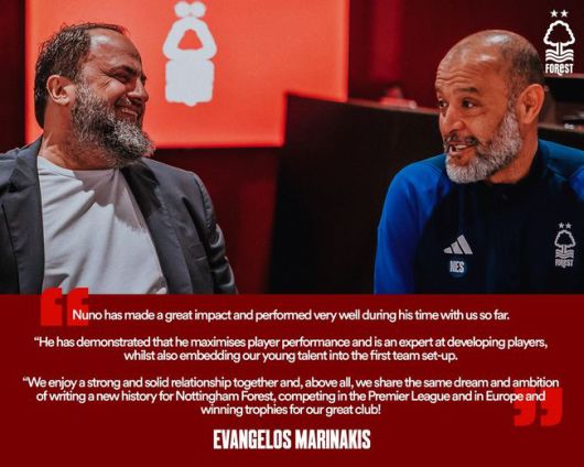 지도력을 인정받은 누누 감독은 "이 환상적인 축구 클럽에서 우리의 여정을 계속할 수 있게 되어 기쁘다. 노팅엄 도착한 이후 선수들, 팬들, 클럽의 모든 사람들 사이에 특별한 유대감을 형성하기 위해 매우 열심히 노력해 왔다. 이는 지난 시즌에 큰 성과를 거두는 데 큰 도움이 됐다"라고 재계약 소감을 밝혔다.
