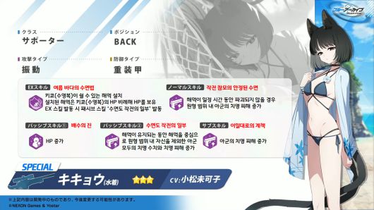 키쿄(수영복)은 원본과 동일한 진동 타입 서포터다. 한 가지 다른 점이 있다면 스트라이커가 아닌 스페셜이다. EX 스킬 '여름 바다의 수면법' 사용 시 지정된 위치에 키쿄(수영복)이 해먹에 누운 상태로 등장한다.