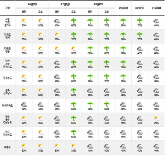 금요일인 27일은 전국 대부분 지역(제주도와 강원영동 제외), 28일(토) 전북, 28일(토)~30일(월) 중부지방을 중심으로 6월 마지막째주 주말에는 비가 내리겠다.