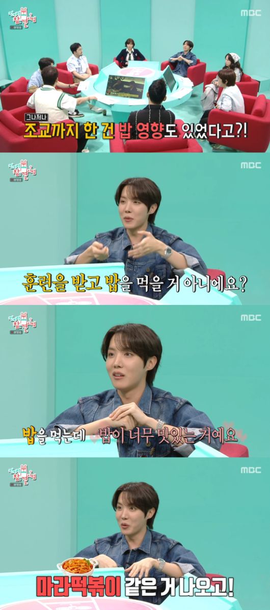 제이홉은 "훈련을 받고 밥을 먹는데 말도 안 되게 너무 맛있었다. 마라 떡볶이가 나왔다. 너무 맛있는게 나와서 여기에 있어야겠다 (싶었다). 여기 신교대 조교를 해야겠다 (싶었다)"라며 조교에 지원한 이유를 밝혔다.