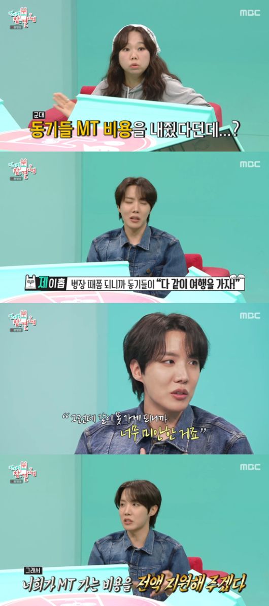 제이홉은 "병장 때쯤 되니까 동기들이 '다 같이 여행 가자'더라. 근데 같이 못 가게 되니까 너무 미안했다. '너희들이 가는 비용을 전액 지원해 줄 테니까 재밌게 놀다 와라' (라고 말했다)"라며 동기 MT 비용을 지원했던 사실을 밝혔다.