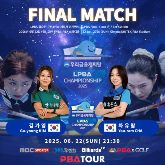 김가영은 지난 시즌 7연속 우승을 따내며 LPBA 무대를 평정했다. 이 대회에서 사상 최초의 8연승에 도전한다. 반면 차유람은 최고 성적이 4강이다. 차유람으로선 김가영에 설욕할 수 있는 기회를 잡았다. 결승전은 22일 오후 9시 30분부터 7세트 경기로 치러진다. 우승 상금은 4000만 원이다.