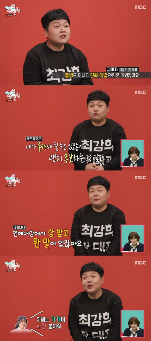미자는 "(최강희가) 촬영으로 온 것도 아니고, 진짜 직업으로 온 거였다. (저는) '네가 불편할 수 있다. 괜히 우리 가게 광고하는 것 같고, 안 해줘도 돼'라고 했다. (최강희가) 연예대상에서 상을 받고 한 말이 있다. '이제는 네가 붙여줘'라고 해서 네가 소심하게 작게 해서 붙여놨다"라며 그동안 사진을 붙이지 않은 이유를 공개했다.