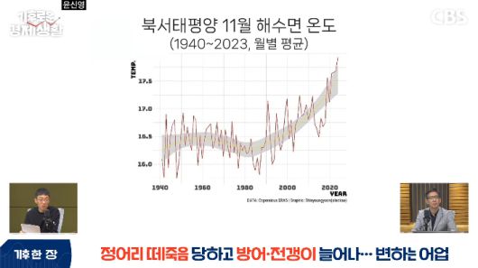◆ 홍종호> 저는 기자님이 1940년부터 그래프를 그리는 게 아주 의미가 크다고 생각하는 게, 1950년 특히 넘고부터는 이산화탄소 배출량이 급증합니다. 전후 급격한 경제 성장과 더불어서 화석연료 사용이 급증하거든요. 탄소 배출량도 그때 급증하고, 그런 것이 바다의 급격한 온도 상승과 무관치 않다는 생각하게 되네요.