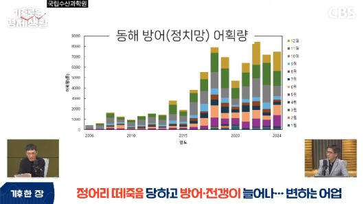 ◇ 윤신영> 바다 수산물 좋아하시는 분들은 이미 체감하고 계시는 부분이 있을 것 같아요. 난류성 어종들이 많이 늘고 있다는 분석이 나오고 있는데요. 대표적인 게 방어, 전갱이, 삼치 같은 것들이 늘고 있다고 해요. 단순히 추정이나 경험적인 게 아니고요. 꽤 데이터들이 쌓여서 국립수산과학원에서도 발표하고 있는데, 2015년 이후로 급격히 증가한 것들이 전갱이와 방어입니다. 어획량 수치가 2015년 이후 2020년 전후로 굉장히 급격히, 전과는 비교할 수 없을 정도로 급격히 늘어 있는 상태고요. 예를 들어서 예전에는 강원도 가장 최북단, 고성 같은 데서는 볼 수 없었던 방어가 지금은 거기서도 잡히고 있다고 해요.
