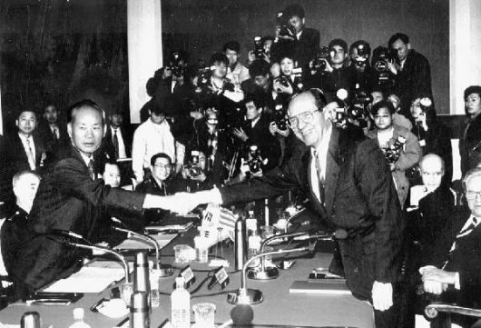 1994년 영변 핵 시설 폭격까지 거론됐던 북핵 위기 다음 해인 1995년 11월 3일 서울에서 열린 제27차 한미연례안보협의회에서 이양호국방부장관과 윌리엄 페리 미 국방부 장관이 악수하고 있다./조선일보DB |