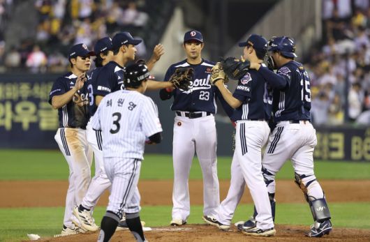 21일 서울 잠실야구장에서 열린 LG 트윈스와 경기에서 승리를 확정한 뒤 기뻐하는 두산 베어스 선수들 |