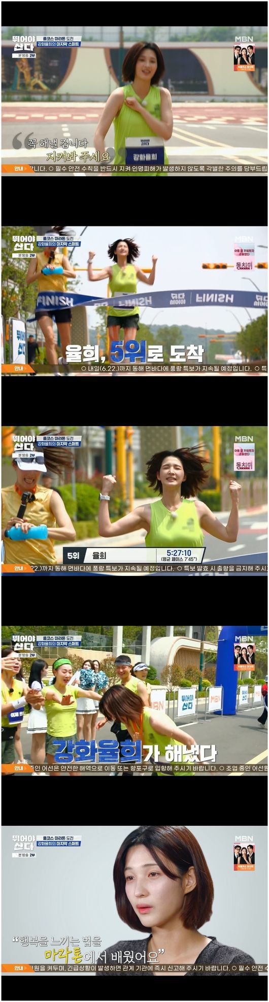 한상보는 “율희 최고! 천천히 완주만 하면 되는 거다”, “네가 대단한 거다. 나는 아무것도 아니다”라며 율희를 독려했고, 마침내 율희는 5시간 27분 10초로 5등으로 완주해 메달을 두 개나 목에 걸었다./osen_jin0310@osen.co.kr