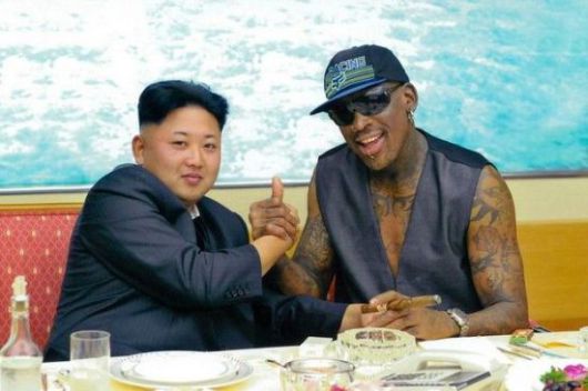 데니스 로드먼이 2013년 방북 당시 김정은 국무위원장과 기념 촬영을 하고 있다. 사진출처=데니스 로드먼 엑스(X·옛 트위터) |