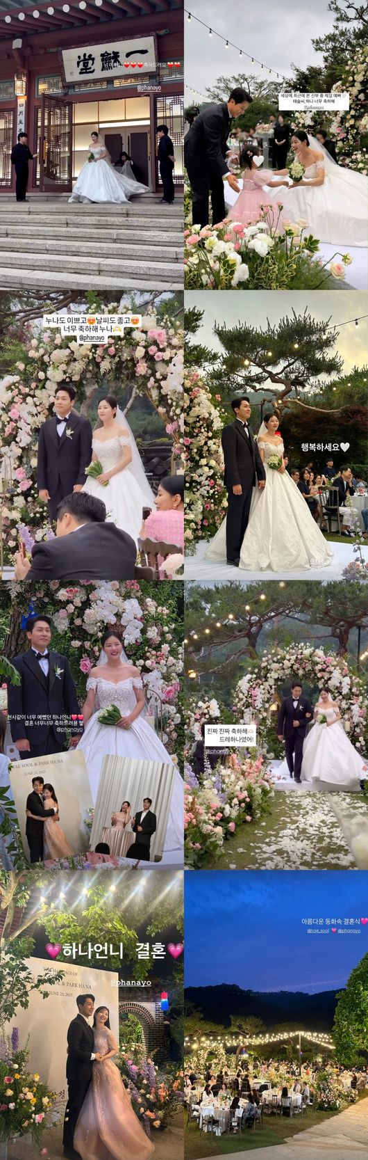 이날 박하나는 결혼식이 끝난 뒤 지인들이 올린 결혼식 현장 사진을 리그램했다. 공개된 SNS 속 영상과 사진에는 행복한 미소를 품으며 웨딩 마치를 울리는 박하나와 김태술의 모습이 담겼다.