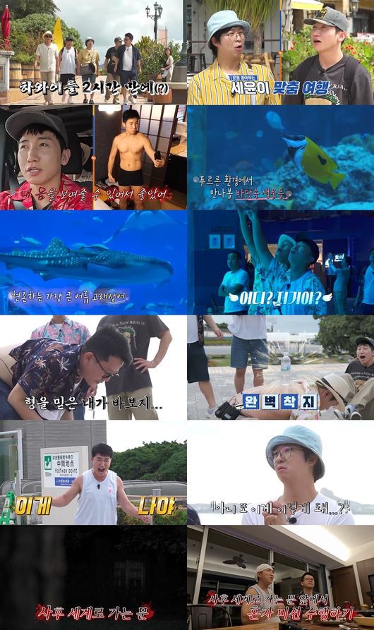 다음 코스로 이들은 ‘츄라우미 수족관’으로 향했다. 바다를 좋아하는 유세윤을 위해 홍인규가 준비한 코스로, 그는 “거기 가면 네가 좋아하는 고래상어도 있어!”라고 외쳤다. 하지만 유세윤은 “먼저 세부에서 고래상어를 보고 좋아했던 것은 내 몸을 보여줄 수 있는 곳이어서 그랬던 것”이라고 반전 속내를 털어놨다. ‘몸짱’ 유세윤의 속마음을 뒤늦게 깨닫게 된 홍인규와 김대희는 “아, 그런 거였구나. 멋지다~”라며 부러워했다. 그러던 중, 홍인규는 갑자기 김준호를 향해 “형이 다시 먹식이가 된 것 같다. 얼굴이 포동포동해졌어”라고 날카롭게 지적했다. 김대희는 “결혼식 전까지 살찌면 안 된다”며 김준호의 ‘요요’를 미리 걱정했다. 이때 홍인규는 요즘 초등학생들 사이에 유행하는 AI 캐릭터들을 언급하면서, “준호 형, 퉁퉁퉁퉁 사후루 같아~”라고 말했다. 유세윤은 “그럼 난 ‘비꼼씨 비꼼싸’로 할래~”라고 받아쳤고, 나아가 김준호에게는 “형은 ‘또또 신랑’ 어떠냐?”라고 즉석에서 캐릭터명을 지어줘 모두를 폭소케 했다.