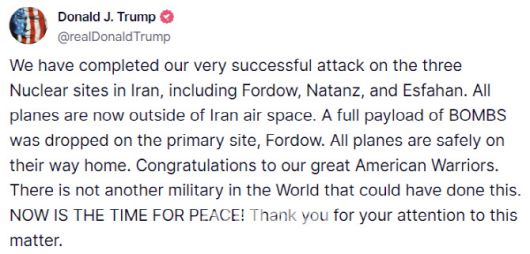 트럼프 대통령은 “주요 기지인 포르도에 모든 폭탄 탑재량을 투하했다. 모든 폭격기는 안전하게 귀환 중”이라며 “위대한 미국 전사들에게 축하를 보낸다. 이 일을 할 수 있는 군대는 전 세계 (어디에도) 없다. 지금은 평화를 위한 시간이다! 이 문제에 관심을 가져줘서 감사하다”라고 덧붙였다.