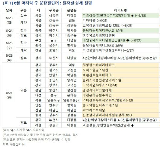 22일 부동산R114에 따르면 6월 4주(23~29)에는 충북 청주시 방서동 ‘동남하늘채에디크’, 서울 성동구 마장동 ‘라봄성동(청년안심주택, 민간임대)’ 등 전국 3개 단지 총 930가구(일반분양 650가구)가 분양한다.