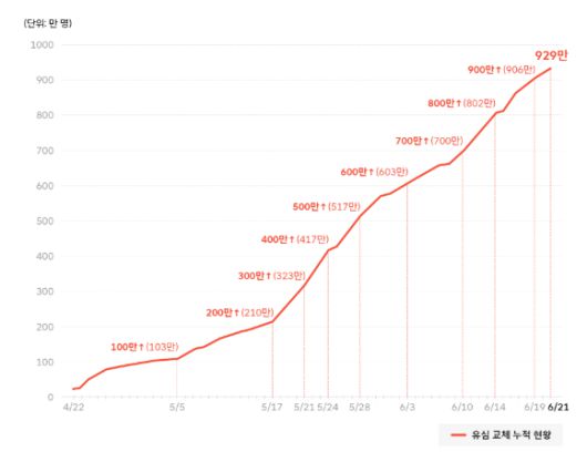 22일 SK텔레콤은 뉴스룸을 통해 이날 0시 기준 누적 929만 명이 유심을 교체했다고 밝혔다.