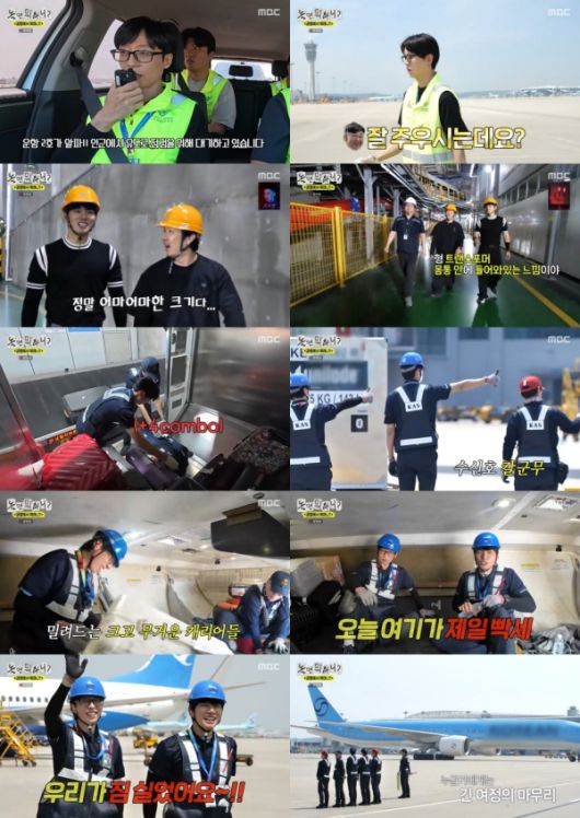 이어 캐리어를 비행기에 싣는 업무에 돌입했다. 대형 항공기에 배정받은 하하와 주우재는 자동화 시스템에 따라 비행기에 탑재되는 화물을 이동시키며 각을 맞춘 '수신호 칼군무'를 선보였다. 소형 비행기의 수하물을 맡은 유재석과 이이경은 '캐리어 지옥'에 입성했다. 화물칸에 직접 들어간 두 사람은 손으로 캐리어를 직접 옮겼다. 두 사람은 좁고 낮은 천장에 부딪히고, 잘 굴러가지 않는 캐리어 바퀴에 어려움을 겪고, 귀마개를 끼지 않으면 안 되는 비행기 소음과 싸워가며 고군분투했다. 유재석은 "오늘 여기가 제일 힘들어!"라며 땀범벅이 된 모습을 보였다.