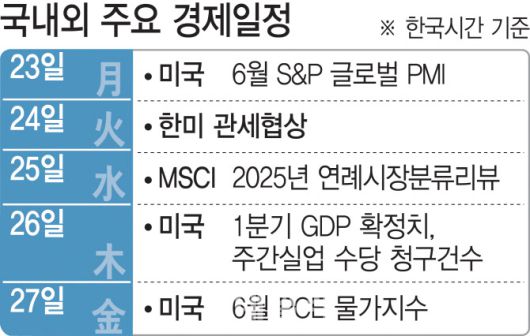 주요 경제지표도 대기 중이다. 오는 23일에는 미국의 6월 S&P글로벌 구매관리자지수(PMI), 27일에는 미국의 6월 개인소비지출(PCE) 물가지수 발표가 예정돼 있다.