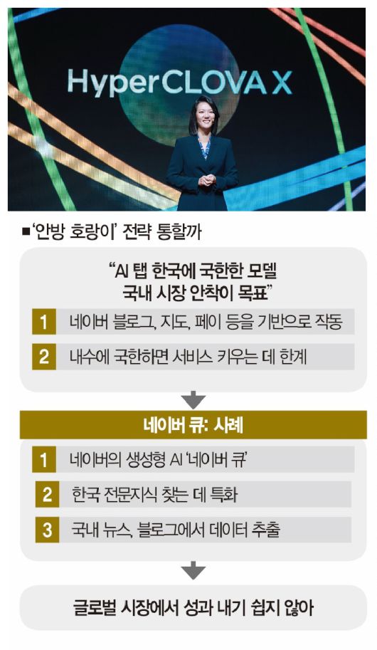 안방을 잡은 뒤 해외 플랜을 세우겠단 건데, 쉽지 않은 길이다. 한국어 위주의 데이터 습득만으론 세계시장에서 경쟁하는 데 한계가 있기 때문이다. 이는 네이버의 생성형 AI '네이버 큐:(Cue:)' 사례에서 잘 확인해볼 수 있다.