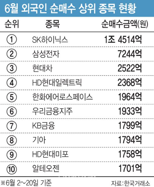 외국인의 순매수 1위와 2위는 SK하이닉스(000660)(1조4514억원), 삼성전자(005930)(7244억원)가 각각 올랐다. 반도체주의 경우 인공지능(AI) 3대 강국 진입을 목표로 내세운 이재명 정부의 정책 수혜가 기대되는 데다, 하반기 메모리 가격 상승에 따른 업황 개선 전망에 힘이 실리며 외국인의 매수세가 쏠린 것으로 분석된다.