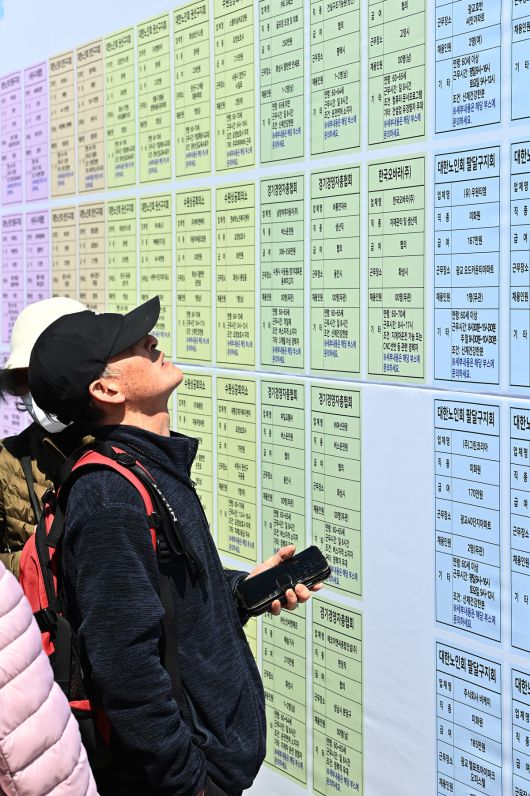 지난 3월 28일 경기도 수원시 팔달구 화성행궁 광장에서 열린 '노인일자리 채용한마당'을 찾은 어르신이 채용정보 게시판을 살펴보고 있다. 뉴시스 |