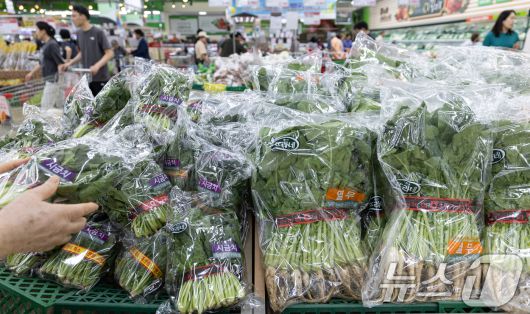 (서울=뉴스1) 이승배 기자 = 열무, 참외 등 여름 제철 농산물 가격이 줄줄이 오름세를 보이고 있다. 22일 한국농수산식품유통공사(aT) 농산물유통정보(KAMIS)에 따르면, 이달 들어 참외 소매 가격은 8.33%, 열무는 14.27% 상승했다. 이외에도 시금치(27.76%), 토마토(12.14%) 등 잎채소와 과채류 전반에서 가격 오름세가 이어지며 밥상 물가 부담이 증가하는 추세다. 22일 서울 시내의 한 대형 마트에서 시민들이 장을 보고 있다. 2025.6.22/뉴스1