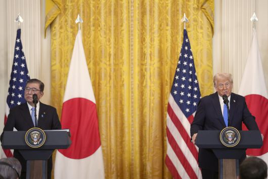 이시바 시게루(왼쪽) 일본 총리와 도널드 트럼프 미국 대통령이 2월 7일(현지시간) 백악관에서 정상회담을 마치고 공동 기자회견을 하고 있다. 워싱턴D.C./AP뉴시스 |
