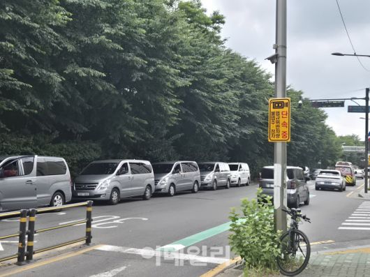 지난 9일 오후 서울 송파구 서울아산병원 안 도로에 송파구청의 불법 주정차 단속 차량이 나타나자 약국 차량들이 하나둘 씩 자리를 피하고 있다. (사진=성가현 수습기자) |