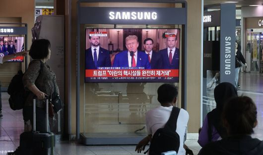 22일 서울역 대합실에서 시민들이 이란 공습 관련 미국 트럼프 대통령의 대국민 연설 방송을 시청하고 있다. 2025.6.22 [사진=연합뉴스 제공] |