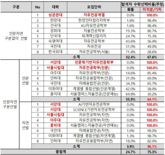 종로학원이 대학입학정보포털 '어디가'에 공시된 연세대, 중앙대, 인하대 등 주요 17개 대학의 정시 일반전형 합격자 수학 선택과목을 분석한 결과, 전공자율선택형인 유형 1 전형 합격자 중 이과생 비율이 75.3%로 압도적으로 높았다. 문과생 기준인 '확률과 통계' 선택자는 전체의 24.7%에 불과했다.