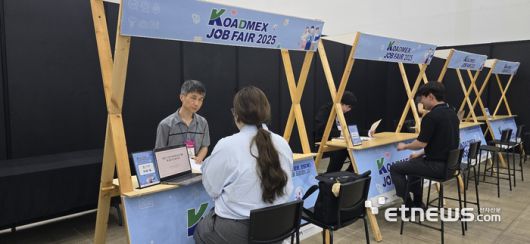 'KOADMEX 잡페어 2025'에서 구인기업 담당자와 구직자가 인터뷰를 진행하고 있다. |